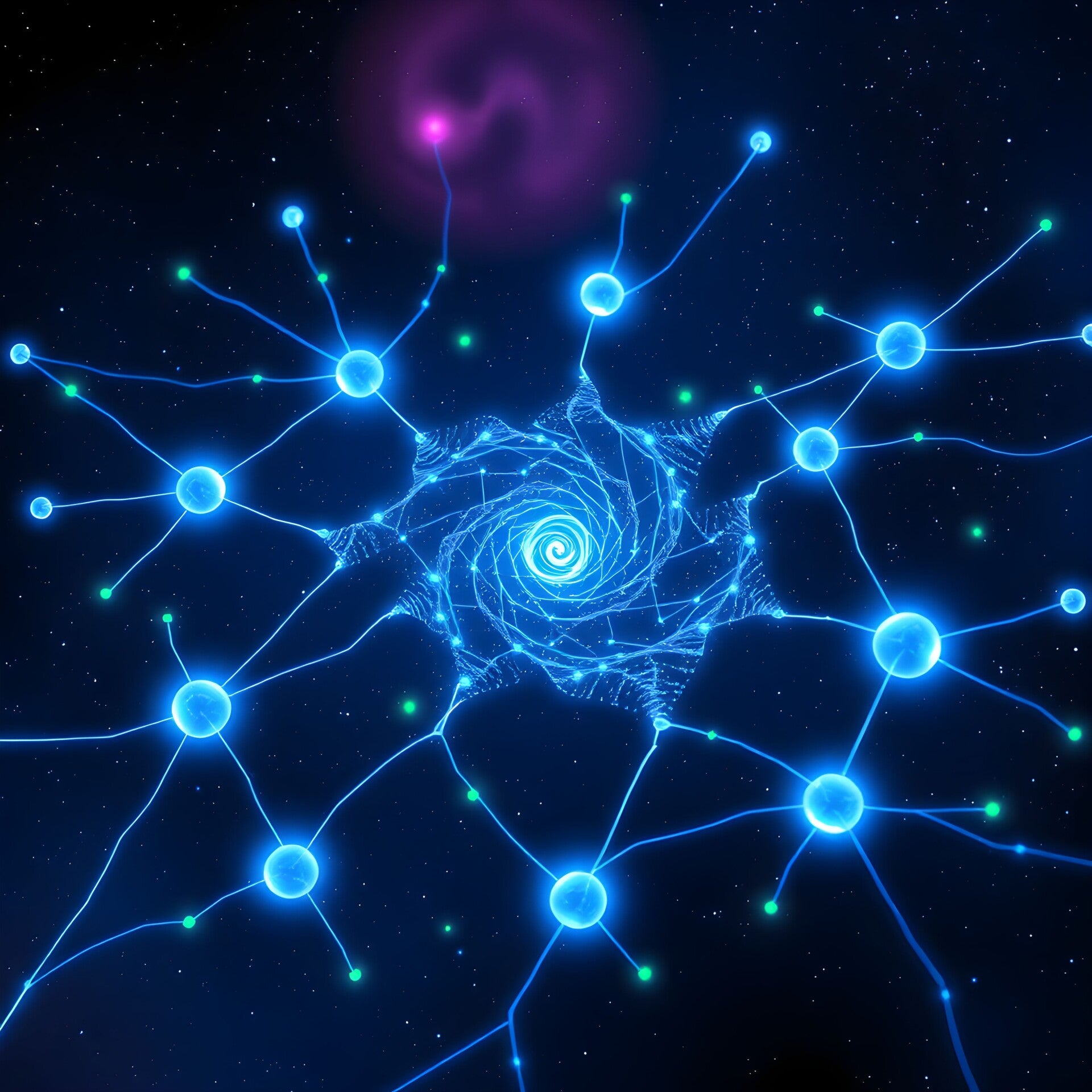 Descripción: Una red neuronal azul neón con 8 nodos conectados por hilos, un vórtice central que parece un agujero de gusano, partículas verdes flotando uniformemente, y un fondo estrellado con una nebulosa magenta en la esquina superior izquierda.